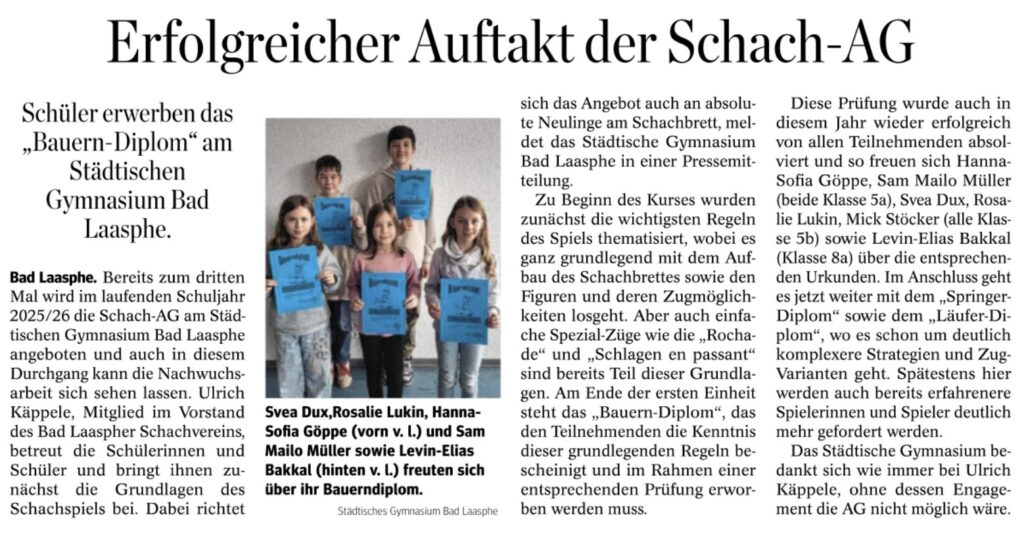 Wir sind stolz darauf, die Nachwuchsarbeit in Bad Laasphe aktiv mitzugestalten. Bereits im dritten Jahr in Folge leitet unser Vorstandsmitglied Ulrich Käppele die erfolgreiche Schach-AG am Städtischen Gymnasium Bad Laasphe.